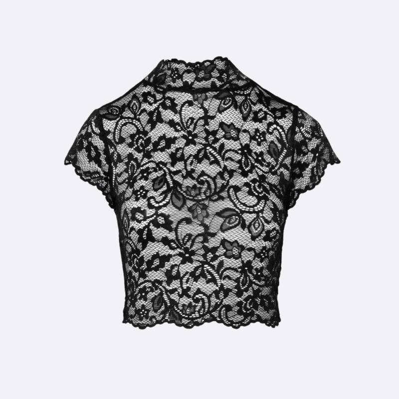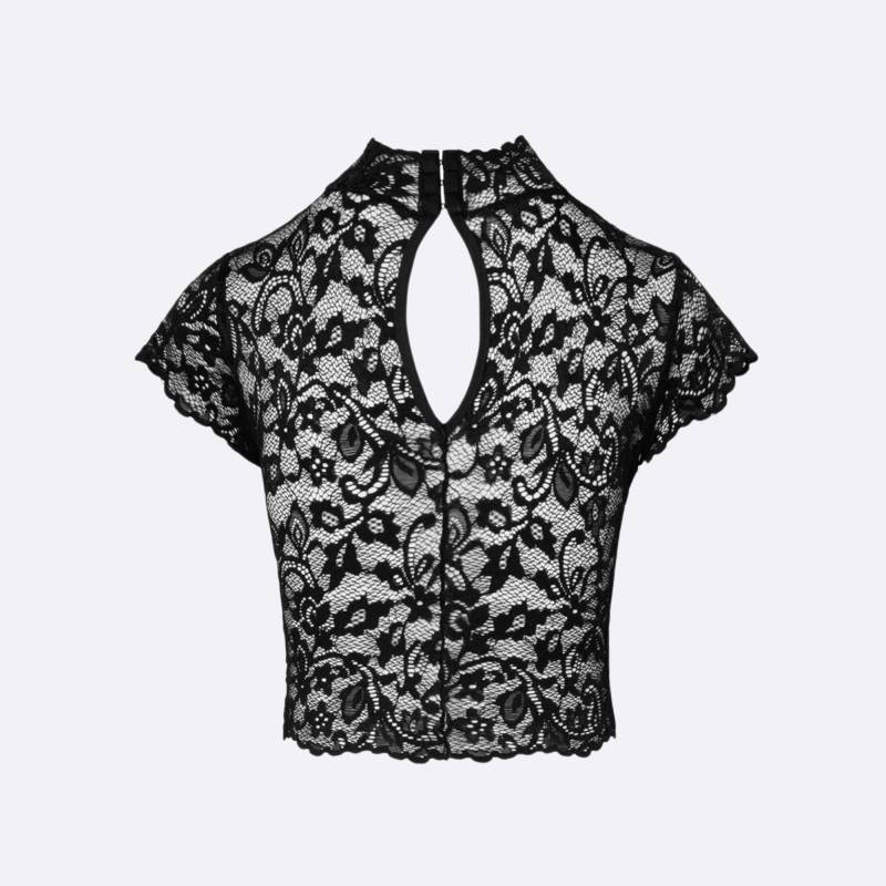 Entdecken Sie unser kurzes Top aus weicher floraler Spitze. Mit seinem dehnbaren Stoff und dem Stehkragen bietet es eine bequeme und elegante Passform. Die Tropfenöffnung am Rücken verleiht einen Hauch von Sinnlichkeit, während der Hakenverschluss für einen sicheren Halt sorgt.