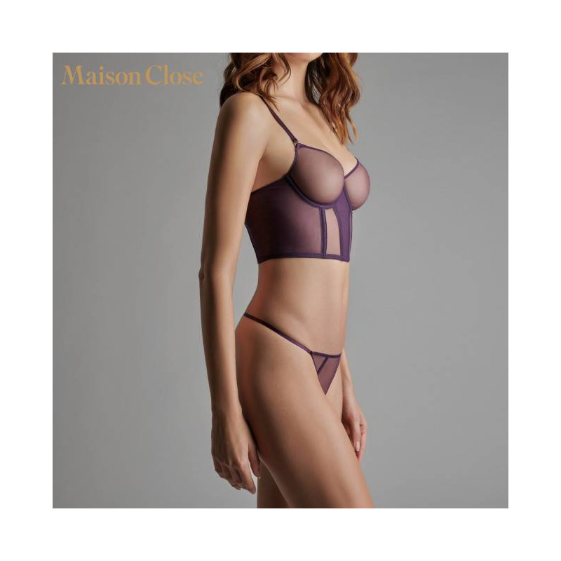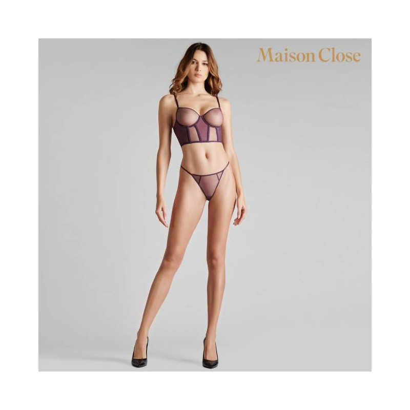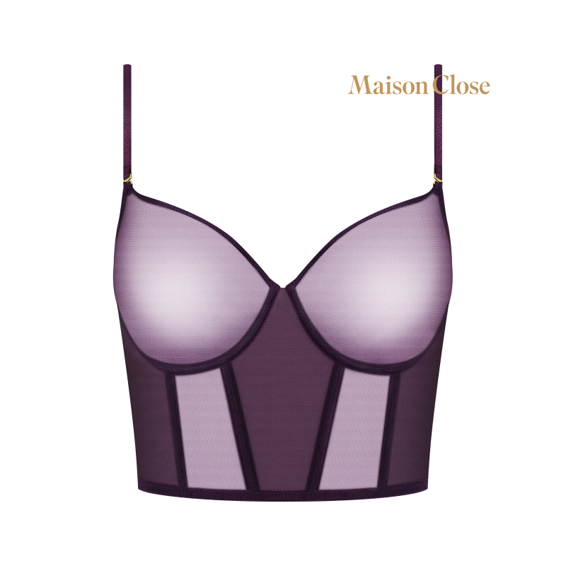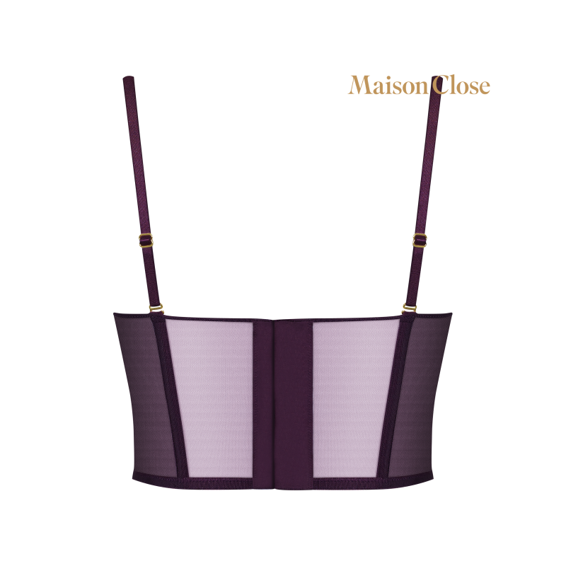 Doppelter Tüll vorne und an den Seiten für einen Kontrast aus Transparenz und Undurchsichtigkeit. Strukturiertes Bustier mit weichen, vertikalen Stäben an der Vorder- und Rückseite. Verschluss am Rücken durch eine glatte, feine Heftklammer. Dünne, abnehmbare und verstellbare Träger.