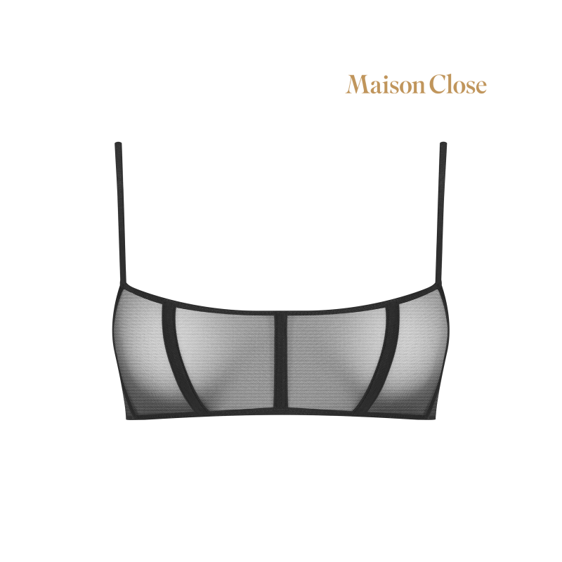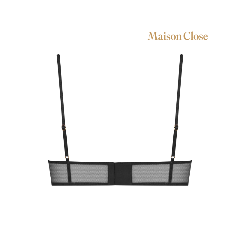 BügelloserKorsett-BH aus absolut transparentem Tüll. Weiche Wale auf der Vorderseite, die das Dekolleté strukturieren. Verschluss am Rücken durch eine glatte, feine Klammer. Schmale, abnehmbare und verstellbare Träger.