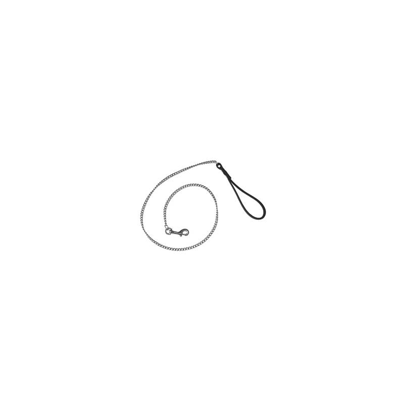 Diese Leine besteht aus einer dünnen Handschlaufe (Griff) aus hochwertigem Leder und einer feingliedrigen Kette aus verchromtem Stahl, die in einem Karabinerhaken endet.