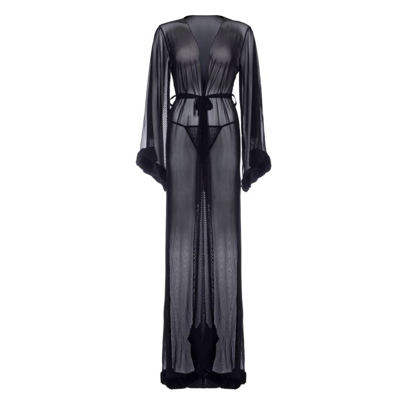 Langer Kimono im Pin Up-Stil aus schwarzem Voile mit Kunstpelz an den Ärmeln und am unteren Rand.