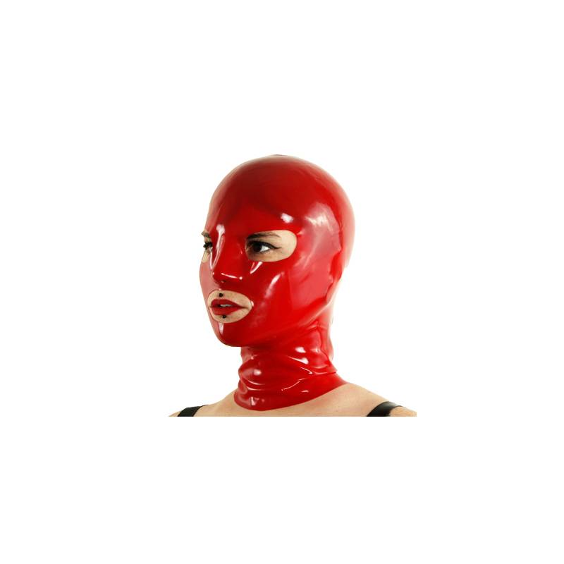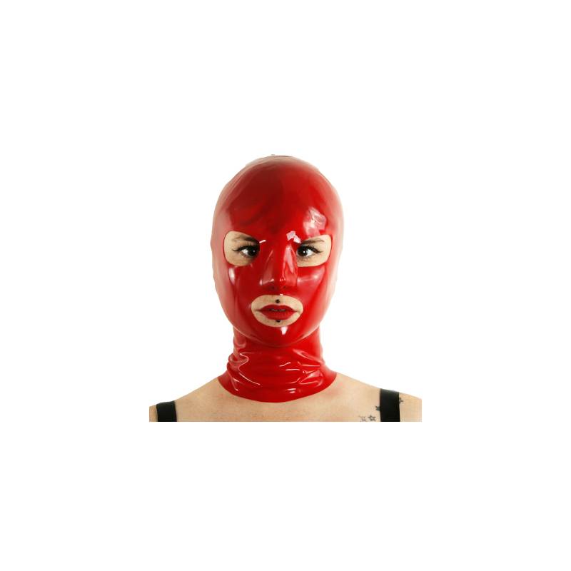 Kapuze aus Latex von sehr schöner Qualität, vorgeformt im Bereich der Nase mit 2 kleinen Öffnungen, 2 breiten Öffnungen für die Augen, einer breiten Öffnung für den Mund und einem Reißverschluss, der sich hinten befindet.