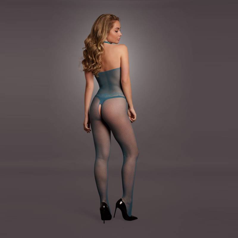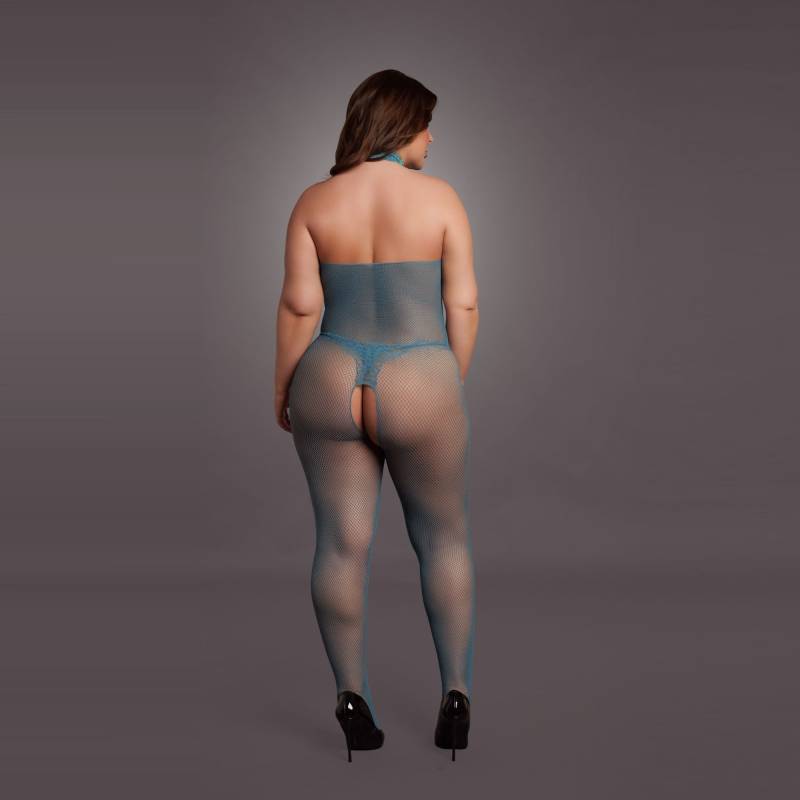 Einteiler aus Netz und Spitze mit Neckholder und offenem Schritt. Der super dehnbare Stoff passt sich Ihrer Größe anErhältlich in verschiedenen Farben und 2 Größen.