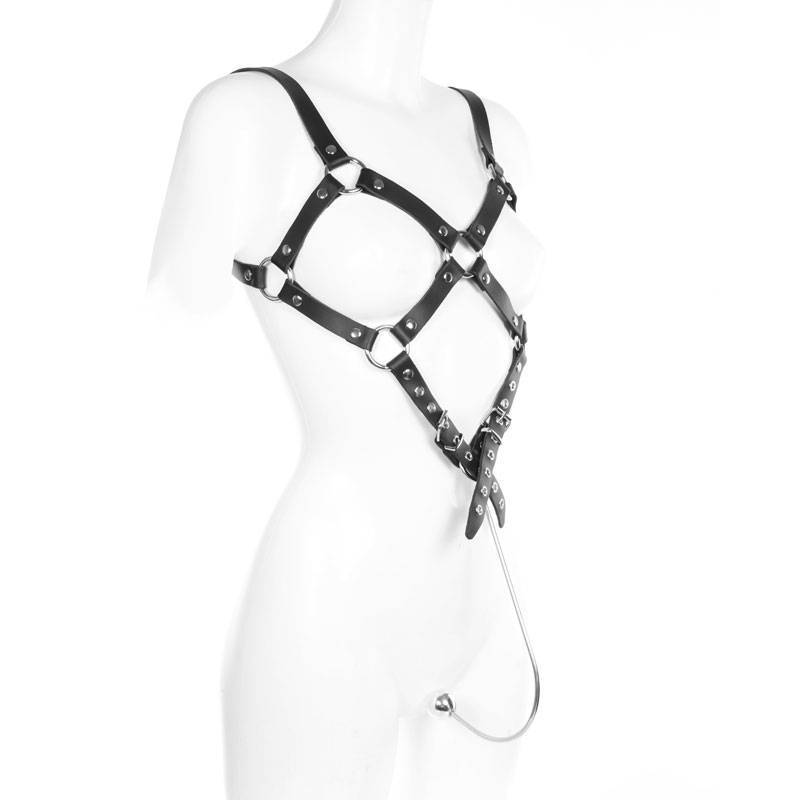 Ledergeschirr für Frauen mit einem Haken und einer Metallkugel. Der Haken ist fest mit einem Metallring verschweißt, der durch vernietete Lederriemen mit dem Geschirr verbunden ist. Die Kugel ist ebenfalls fest.