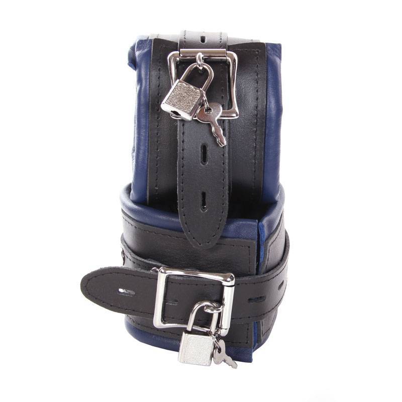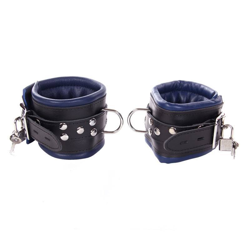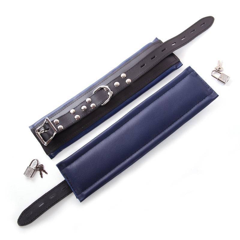 Sehr schöne Knöchelschützer aus schwarzem und blauem Leder, sehr praktisch und bequem, da sie auf der Innenseite mit Fleece gefüttert sind. Sie lassen sich mit Hilfe eines vernieteten Riemens öffnen und schließen, der mit einem Vorhängeschloss gesichert ist (5 verschiedene Einstellungen sind möglich). An beiden Fußfesseln befindet sich ein Ring, mit dem sie mithilfe einer Kette oder eines Karabiners (nicht im Lieferumfang enthalten) aneinander oder an einer beliebigen Stelle befestigt werden können.