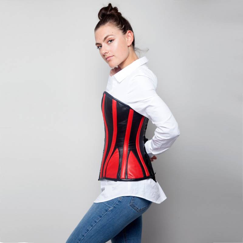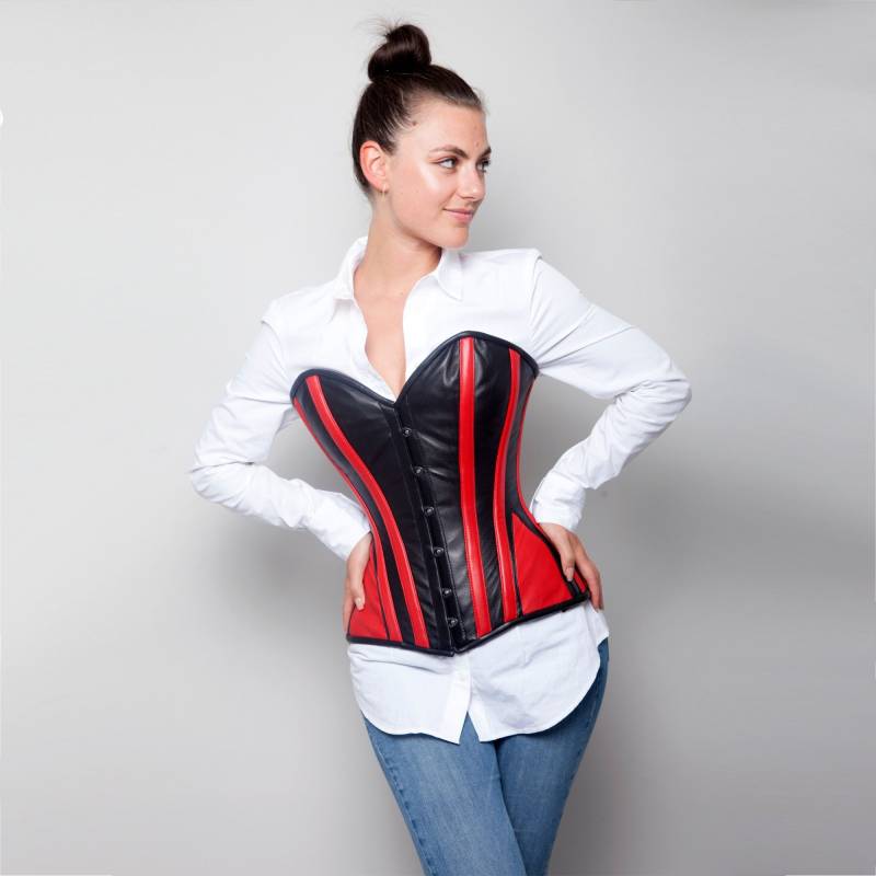 Korsett aus schwarzem und rotem Leder, das die Brust umfasst, gute Qualität, halbsteife Stäbe, vorne mit 6 Haken geschlossen und hinten geschnürt.