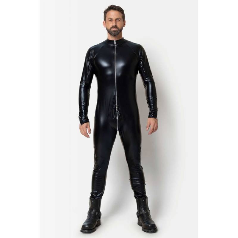 Schwarzer Overall für Herren aus lackiertem Lycra, vorgeformter Achselbereich, langer Reißverschluss bis zum unteren Rücken mit 3 Reißverschlüssen und ein Reißverschluss am unteren Ende jedes Ärmels. Passt sich perfekt an die Form an. Sehr bequem, aber nehmen Sie eine Nummer größer als Sie: Es fällt klein aus...