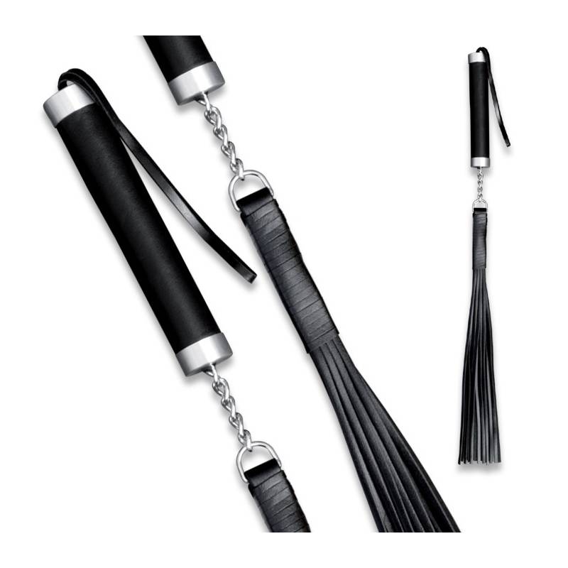 Ledermartinette mit 16 Riemen aus hartem Leder. Der Stiel ist durch eine Metallkette mit einem Griff aus Metall und Leder verbunden.
