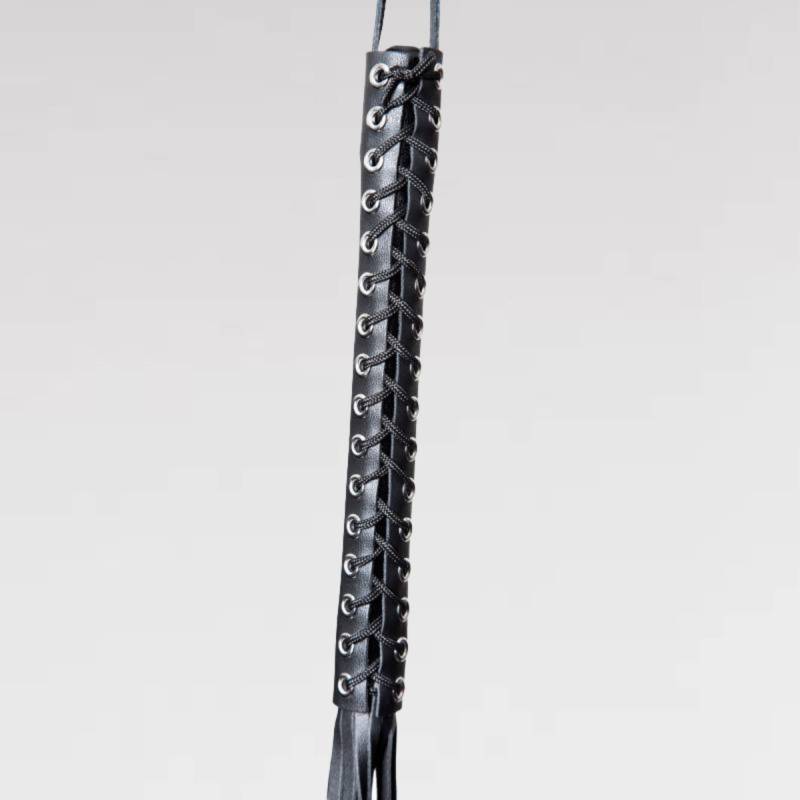 Der Martinet besteht aus 11 Riemen aus Kunstleder und bietet ein "hartes" Gefühl. Sein Griff ist mit dekorativen Schnürsenkeln versehen, die für einen eleganten "Korsett"-Effekt sorgen. Seine Gesamtlänge beträgt 77 cm, wobei der Griff 27 cm misst.