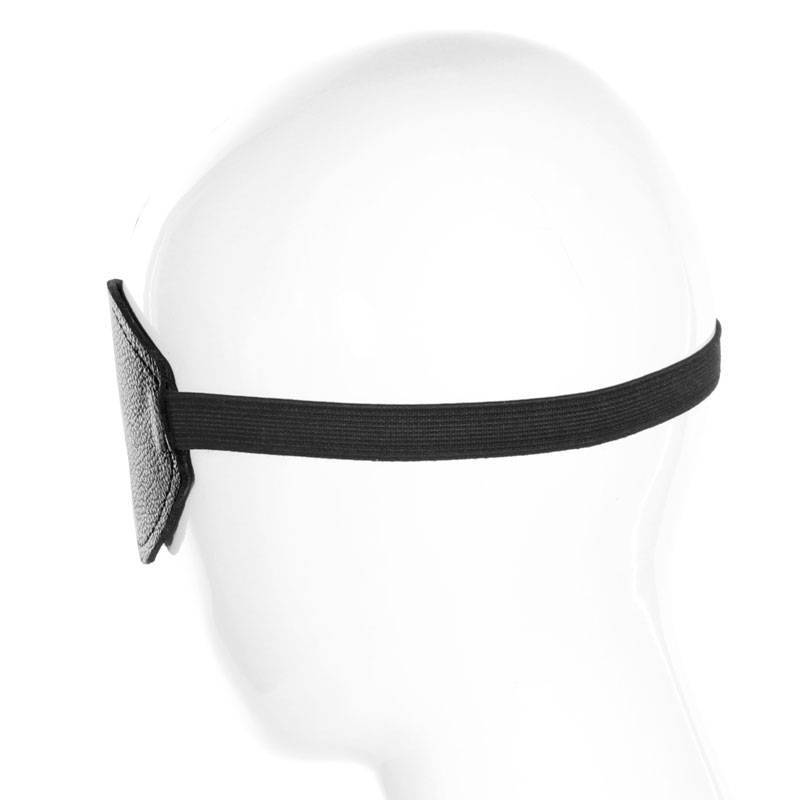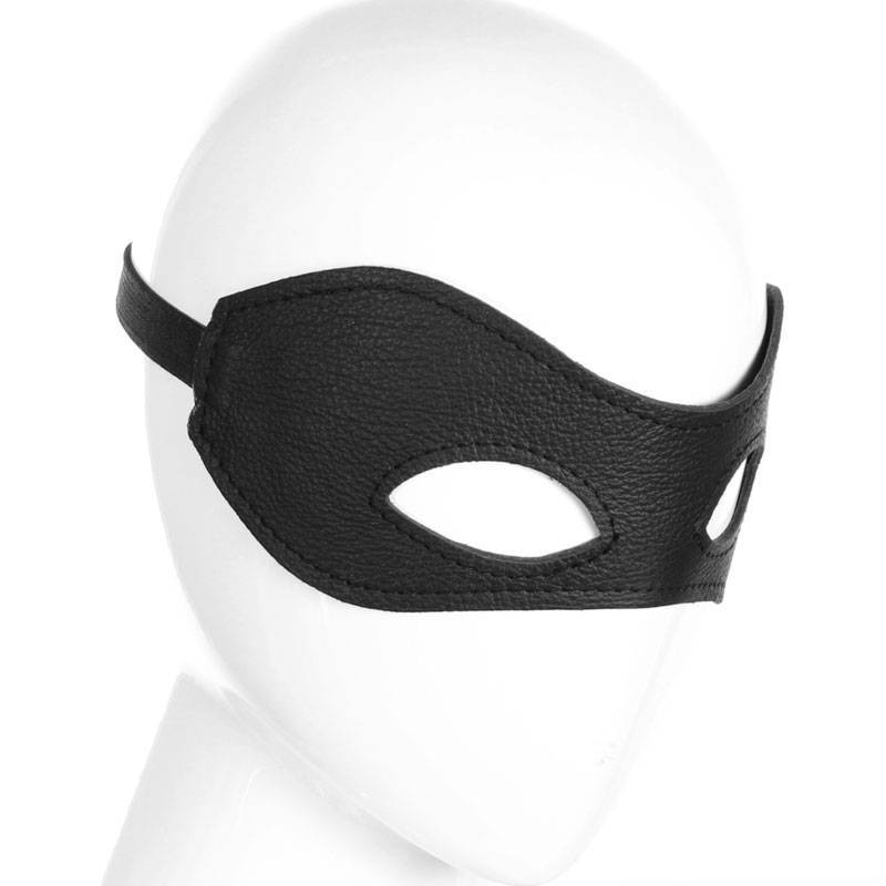 Maske aus weichem, schwarzem Knackleder. Sie wird sich perfekt an deine Gesichtsform anpassen. Augenöffnung und elastisches, nicht verstellbares Kopfband.
