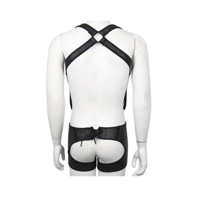 Es besteht aus der Jock Boxer mit einer großen Öffnung auf der Rückseite und einem Harness mit Karabinerhaken und Kreuzform auf dem Rücken.