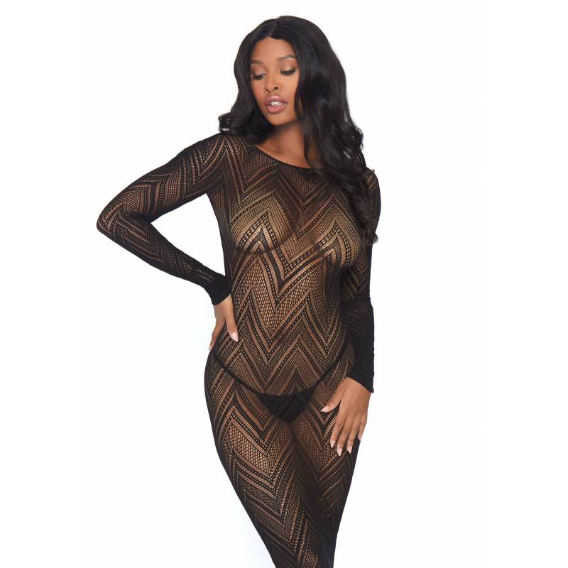 Langes schwarzes Netzkleid mit Fischgrätenmuster.
