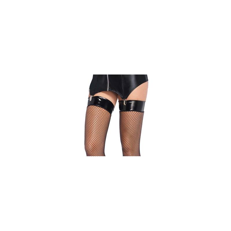 Strümpfe der Marke Leg Avenue aus relativ feinmaschigem Netzmaterial mit Strumpfhaltern aus schwarzem Vinyl.