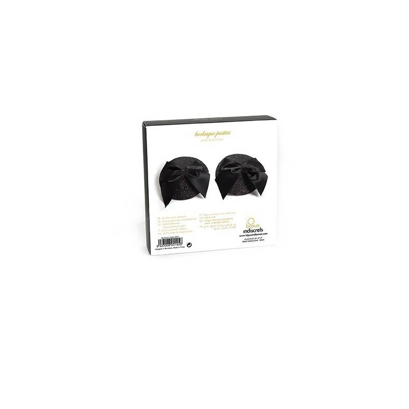 Diese Nippelhüllen von Bijoux Indiscrets sind selbstklebend und wiederverwendbar. (Sie müssen nur den klebenden Teil mit einer ph-neutralen Seife reinigen und trocknen lassen). Sie sind mit kleinen schwarzen Satinschleifen in der Mitte verziert.