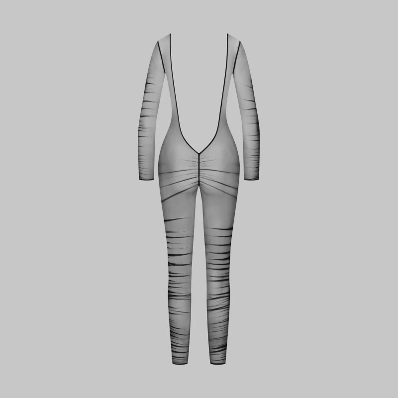 Catsuit mit langen Ärmeln und Neckholder aus Jersey mit glänzenden und subtil transparenten Reflexen. Der gesamte Körper ist mit Nahtfalten strukturiert, doch am Rücken zeigt die Haut ihre wahre Nacktheit durch ein tiefes Dekolleté. Ultra visuell wird der Körper durch einen subtilen Tiger-Effekt sublimiert.
