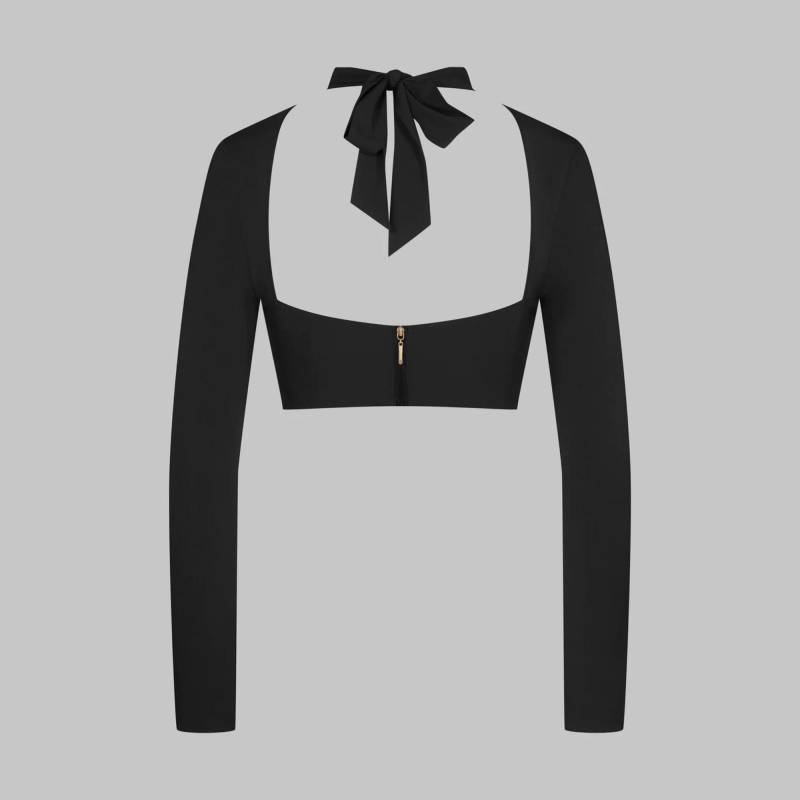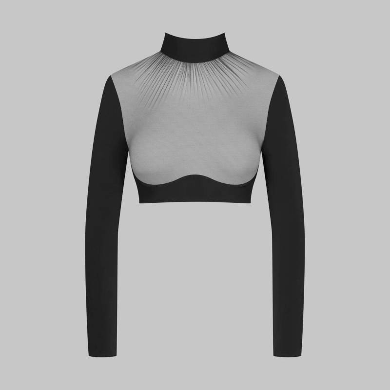 Top mit langen Ärmeln aus zwei Materialien mit Oben-ohne-Effekt unter der Transparenz des Tülls. Vom Kragen aus entstehen elegante Falten. Unter der Brust sorgt der mit blickdichtem Material bedeckte Bügel für einen ausgezeichneten Halt. Ein eleganter Neckholder mit einem Schal, der je nach Wunsch im Nacken gebunden werden kann, und einem Reißverschluss, der mit einem goldenen Schmuckstück verziert ist.