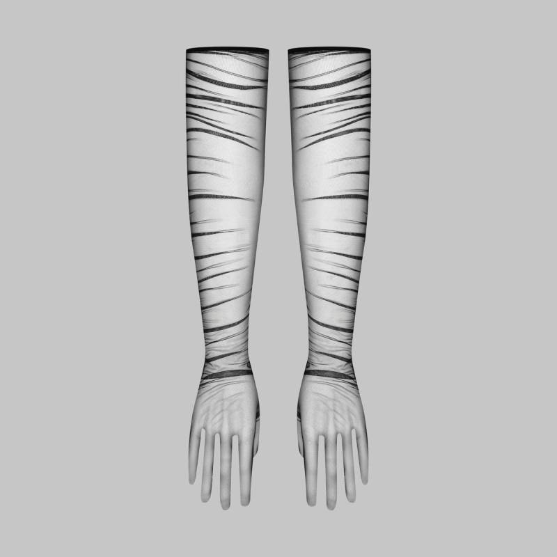 Opernhandschuhe aus hochtransparentem Tüll. Ein Spiel aus Plissee und Nähten, das Ihre Hände und Unterarme stilvoll strukturiert.