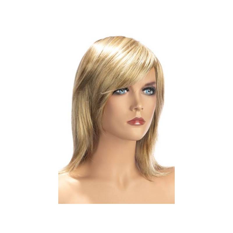 Mittellange, gesträhnte blonde Perücke.