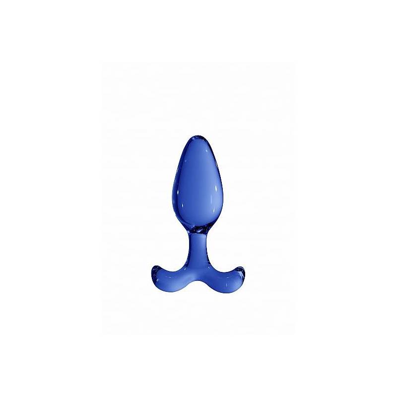 Ein handgefertigter Plug aus blauem Borosilikatglas für Analspiele.