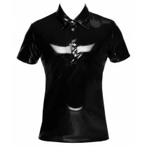 Schwarzes, glänzendes Vinyl-Poloshirt. Schmale, körperbetonte Passform und klassischer Polo-Stil mit halben Ärmeln, Kragen und kurzem Druckknopfverschluss auf der Vorderseite.