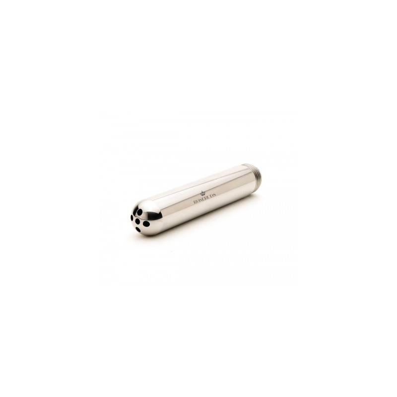 Handbrause für anale oder vaginale Einläufe in zylindrischer Form. Am Ende der Brause befinden sich 5 Löcher, um das Wasser durchzulassen, und ein Schraubgewinde an der Basis der Brause, um sie an einen Duschschlauch im herkömmlichen Format anzubringen.