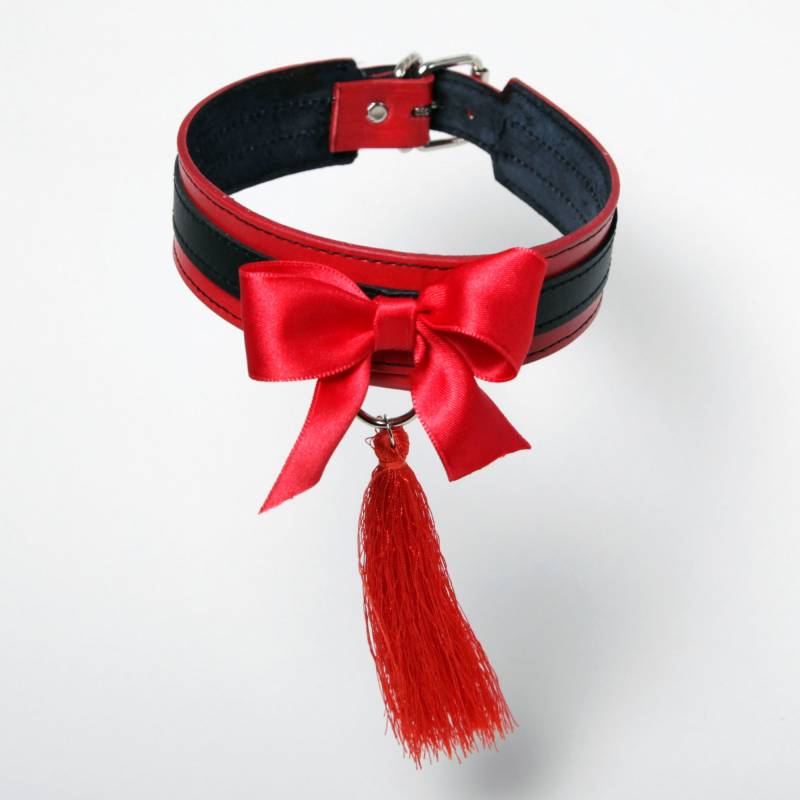 Lassen Sie Ihre Fetischpartys glänzen, mit diesem einzigartigen Stück. Sie wurde von La Boutique des Colliers de Muse angefertigt und besteht aus hochwertigem Leder. Diese sehr schöne Kreation, die auf der Vorderseite eine hübsche rote Satinschleife und ihre Pampille aufweist, ist auf der Rückseite der Halskette dank der 7 Löcher leicht verstellbar.