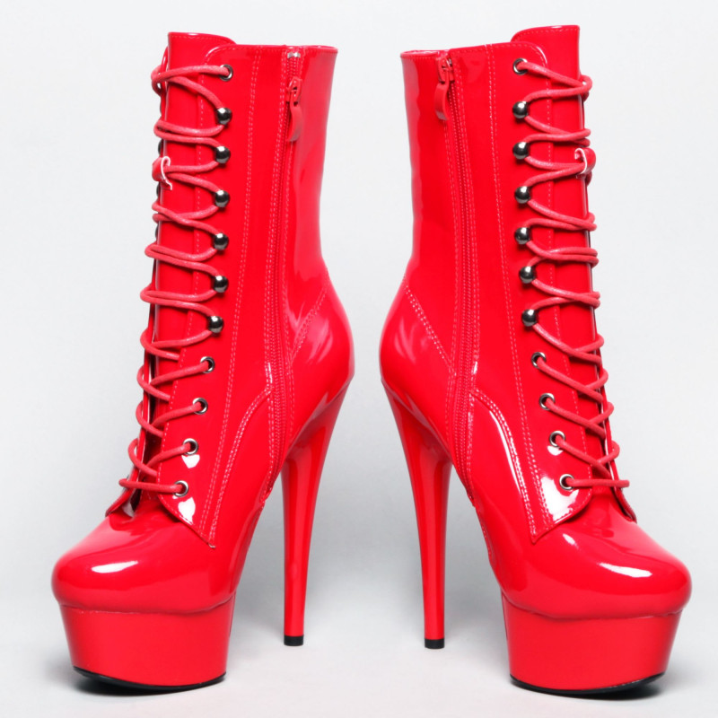 Die Plateaustiefelette Vinyl Rot ist ein Schuh, der durch sein einzigartiges Design und seinen selbstbewussten Stil auffällt. Der äußere Absatz ist 15 cm hoch, während das Plateau eine Höhe von 5 cm hat, wodurch ein Effekt von geschwungenen und verlängerten Beinen entsteht, der nicht unbemerkt bleiben wird.