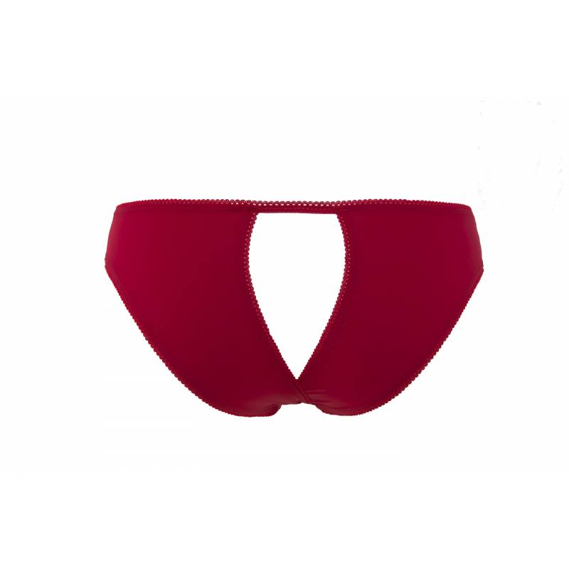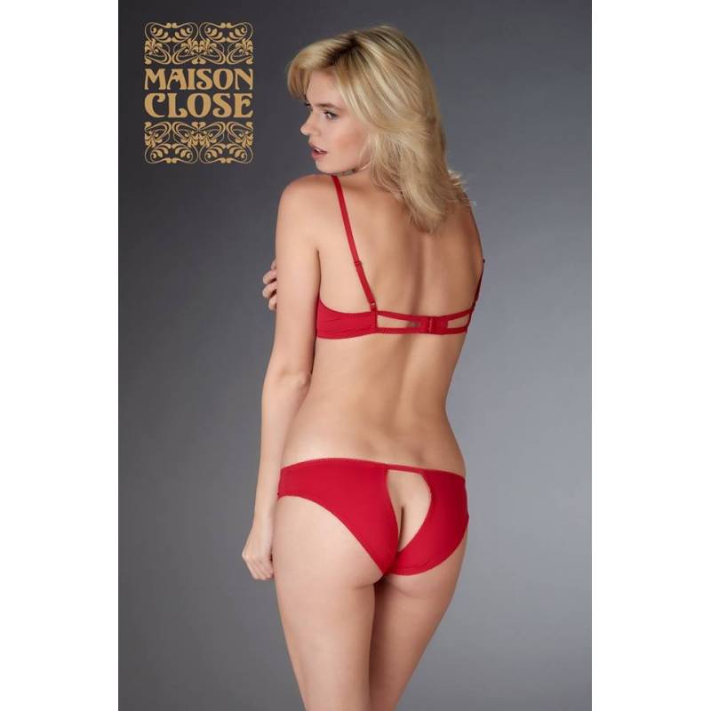 Offener, überkreuzter Slip in Rot aus der Kollektion "Le petit secret" von Maison Close . Sie ist im Schritt in zwei gekreuzte Teile geteilt und bietet so eine praktische Öffnung sowie einen entblößten Bereich auf der Vorder- und Rückseite