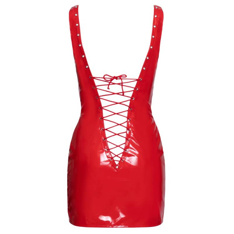 Rotes Vinylkleid mit tiefem Ausschnitt und Schnürung vorne und hinten.