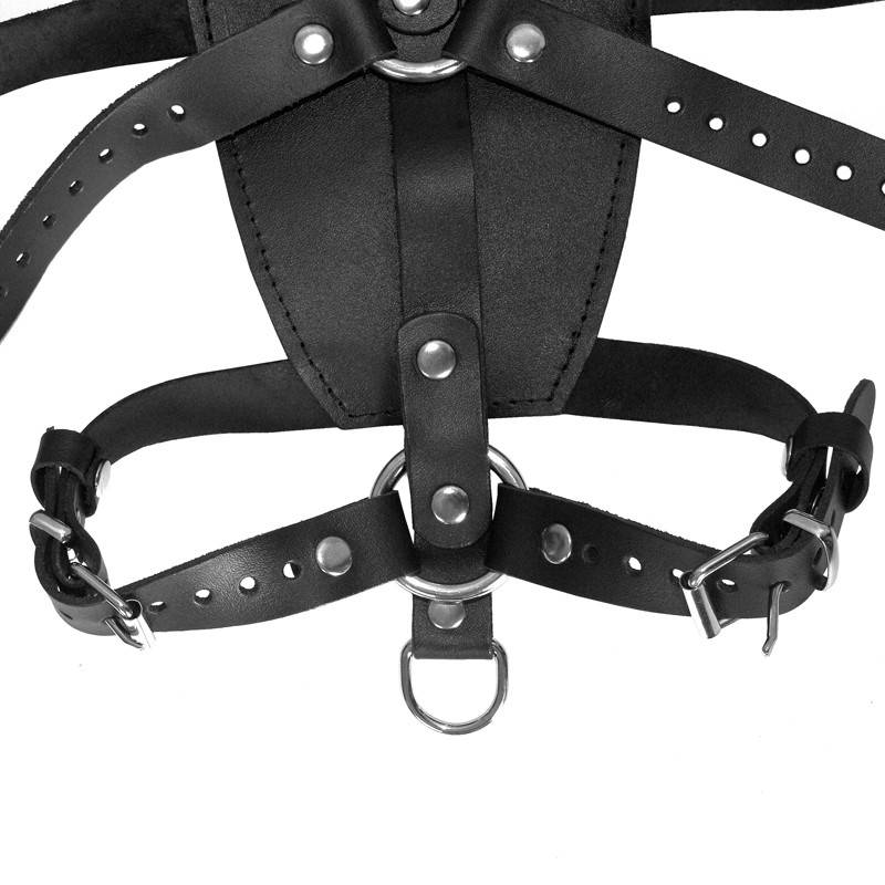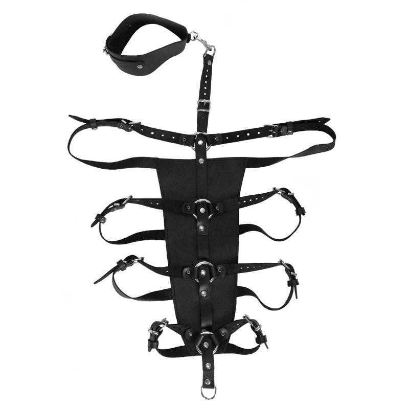 Ein breites Lederstück für den Rücken, bestehend aus einem genieteten Riemen mit 4 Ringen und 8 Riemen, mit denen Sie den Oberkörper Ihres Opfers problemlos fesseln können. Dieses Zwangsinstrument umfasst auch ein dickes Lederhalsband, das mit einem Karabinerhaken an das Ganze angehängt und mit einer Schnalle geschlossen wird