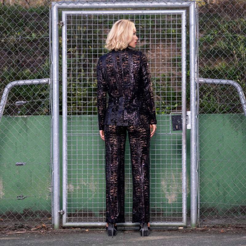 Verleihen Sie Ihrem Stil das ganze Jahr über einen Hauch von Glamour mit unserer schwarzen Hose aus Spitze mit Pailletten und hautfarbenem Netzstoff. Sie ist gerade geschnitten und hat einen elastischen Bund für optimalen Tragekomfort. Kombinieren Sie sie mit unseren Netz- oder Lingerie-Oberteilen und für einen kompletten Look mit unserem Rylee-Blazer.