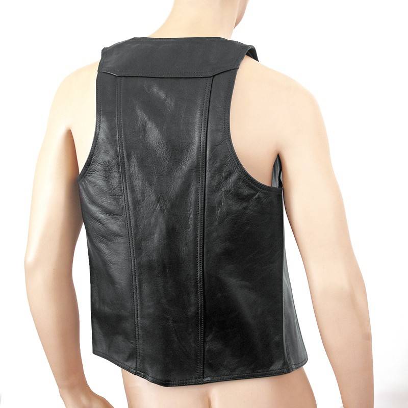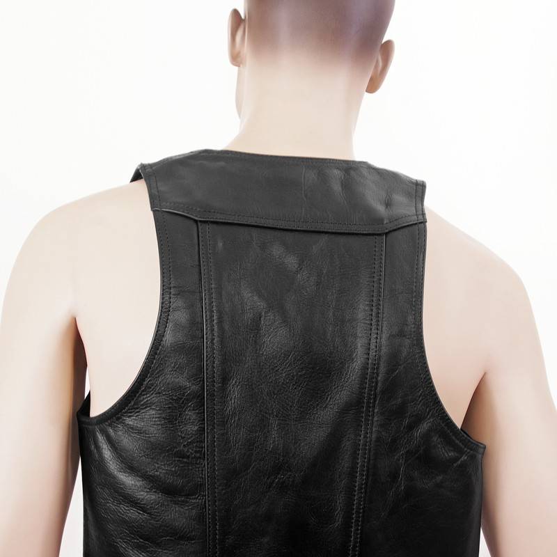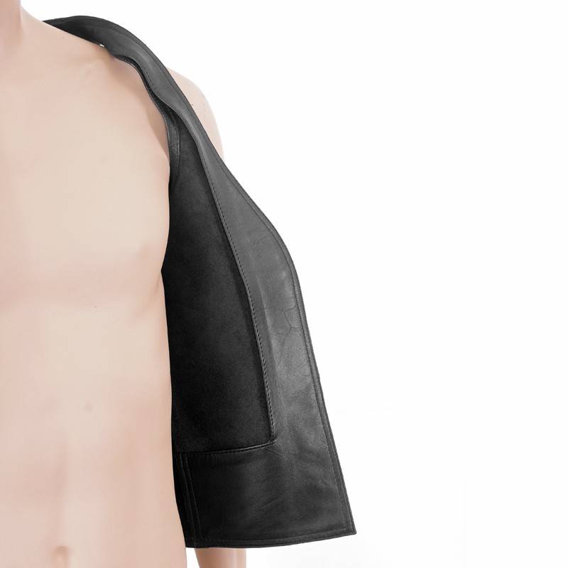 Eine Weste aus hochwertigem schwarzem Leder mit großen Öffnungen an den Armen.