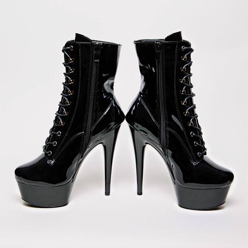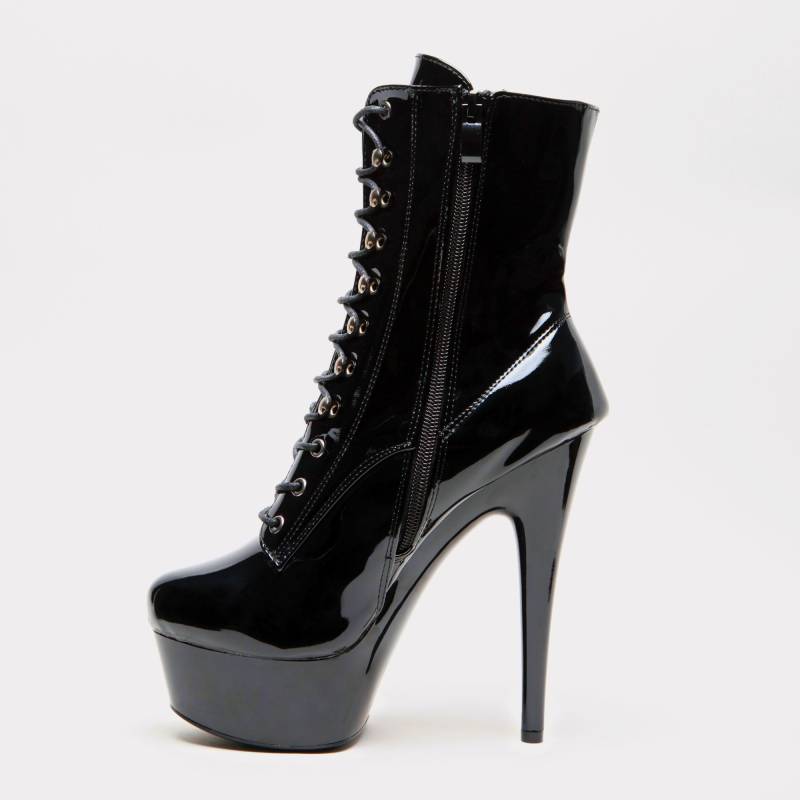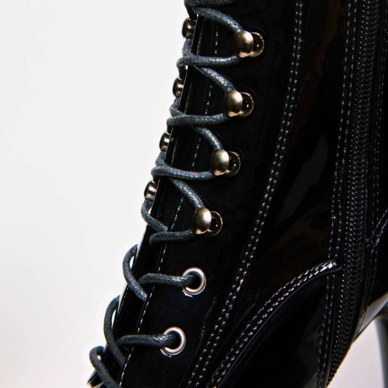 Schwarze Vinyl-Stiefeletten mit Plateau + Schnürung