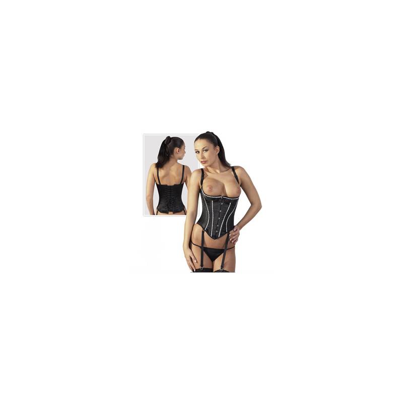 Dieses Korsett aus schwarzem Satin folgt dem Prinzip des Brusthochzuges: Die Polster stützen Ihre Brust, ohne etwas zu verbergen. Weiße Spitzenbänder betonen die 4 vorderen Stäbchen und die Halbschale.