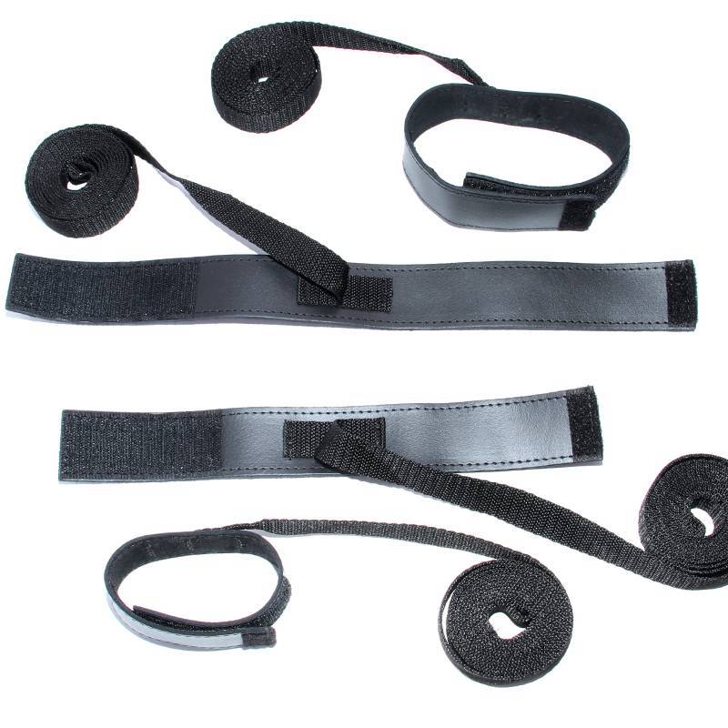 Das Set besteht aus vier 1,90 m langen Gurten, an deren Enden sich Hand- und Fußfesseln aus Leder mit Klettverschluss befinden.