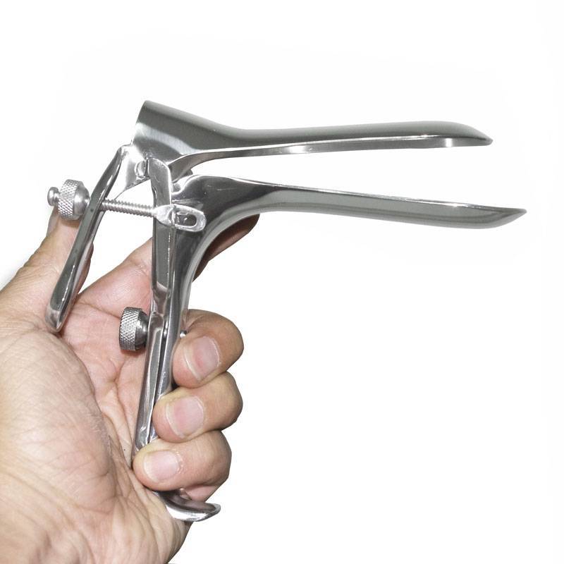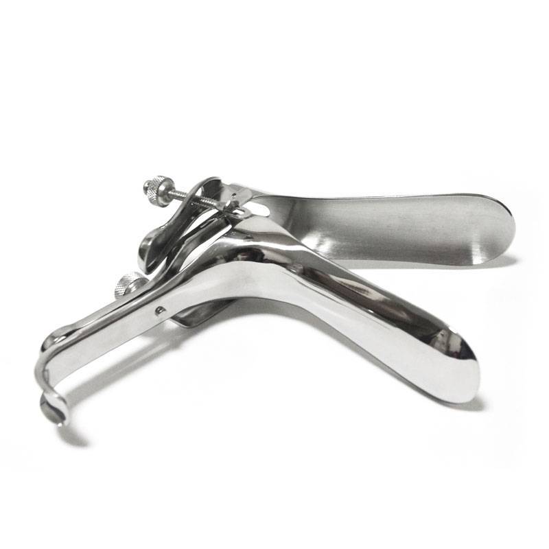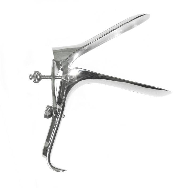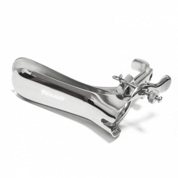 Spekulum aus medizinischem Stahl mit dem Stempel "Dèmonia", mit einer Stellschraube am Griff und einer weiteren Schraube, mit der der Abstand beibehalten werden kann.