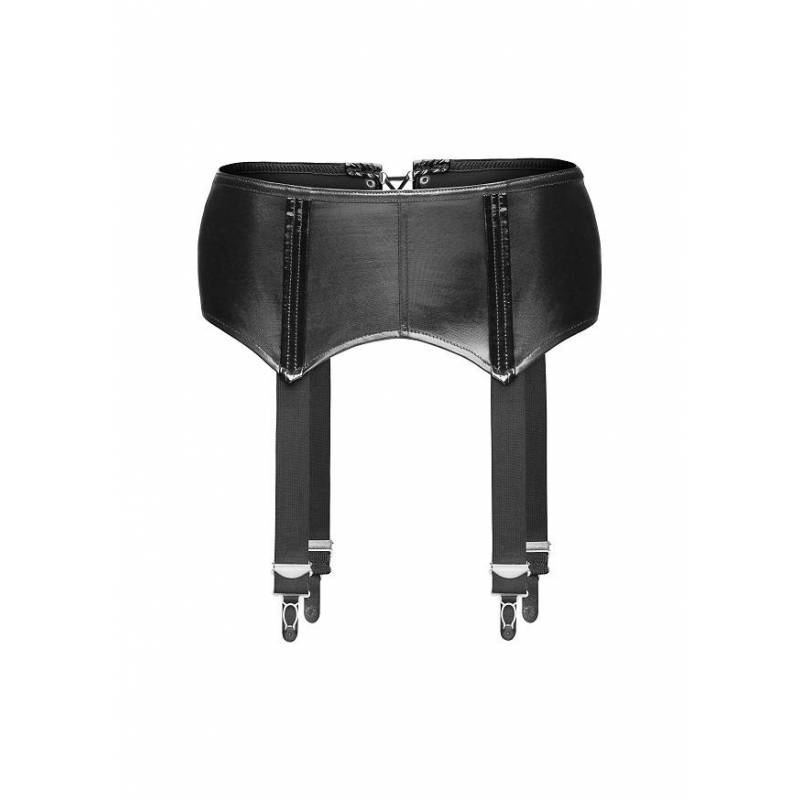 Strapsgürtel aus schwarzem Wetlook mit Vinylstreifen-Detail.