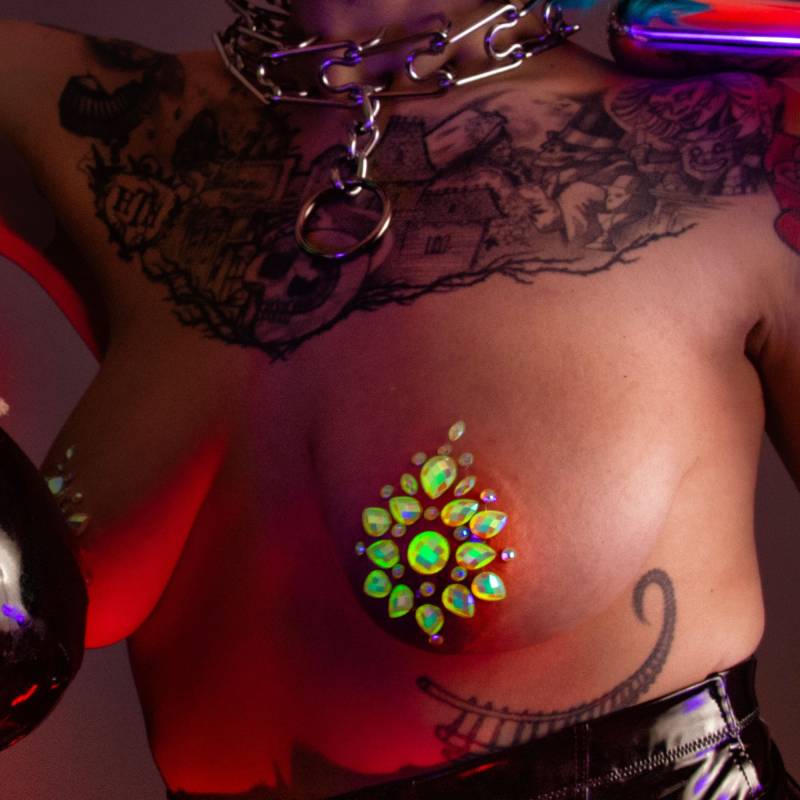 Diese Sticker verleihen jedem Outfit sofort Glamour - oder natürlich keinem Outfit. Betonen Sie Ihren schönen Körper mit ein wenig Glanz und stehlen Sie die Show! Dieser Sticker leuchtet im Dunkeln und ist so konzipiert, dass er im Gesicht getragen werden kann.
