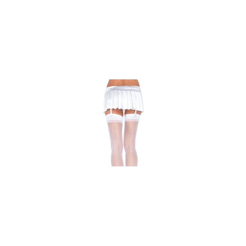 Weiße Strümpfe der Marke Leg Avenue mit breiten Streifen am Oberschenkel und einer weißen Naht auf der Rückseite des Beins.