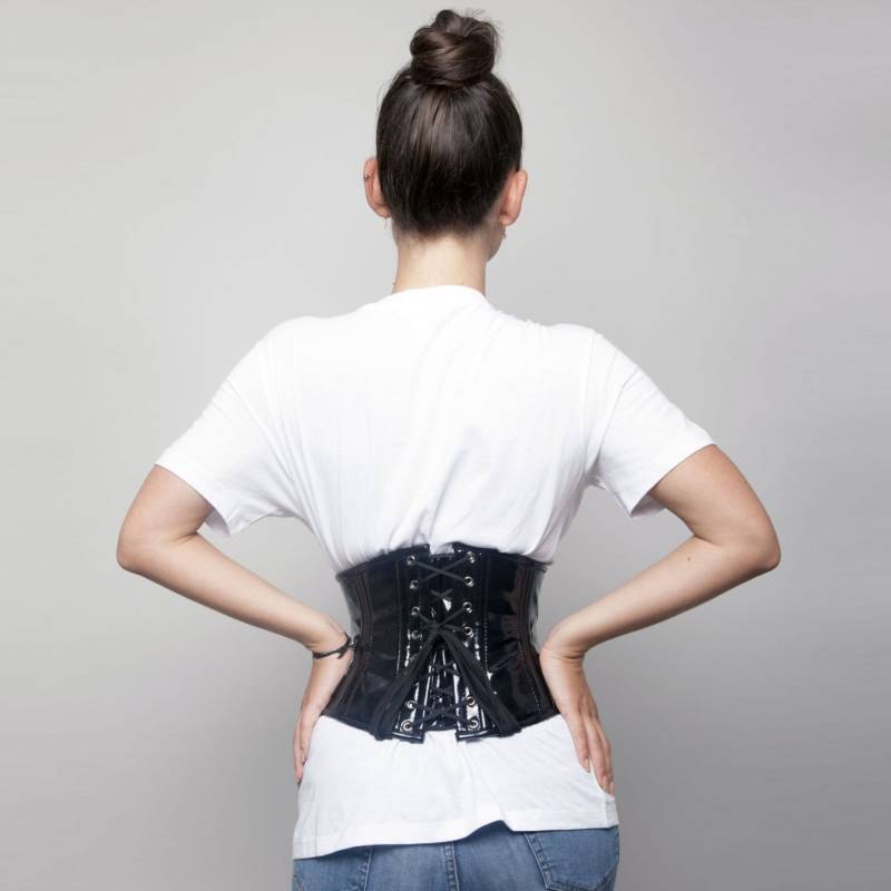 Sehr kurzer Bund aus schwarzem Vinyl mit halbsteifen Stäben, vorne mit 4 Haken geschlossen und im Rücken geschnürt.