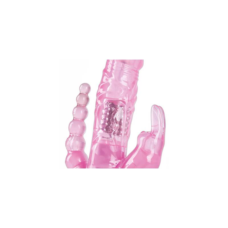 Gönnen Sie sich Vergnügen hoch drei mit diesem Vibrator mit dreifacher Stimulation. 1, Vibro mit kleinen Metallkugeln für eine innere Massage, 2, ein kleiner Hase für die klitorale Stimulation und 3, ein Analstimulator mit abgestuften Perlen.