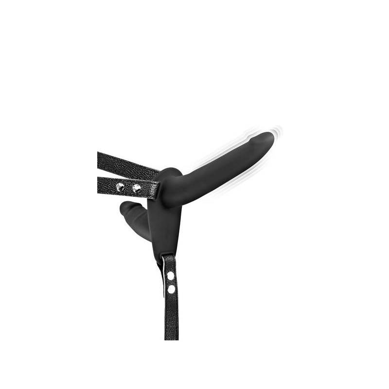 schwarzer, vibrierender Doppel-Gürteldildo, bestehend aus einem inneren und einem äußeren Dildo, mit einer vibrierenden Penetration, die für beide Partner von Vorteil ist.