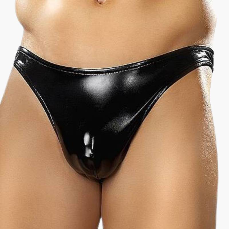 Entdecken Sie den schwarzen Vinyl-Jockstrap, ein gewagtes Stück, das Stil und Komfort miteinander verbindet. Sein breiter Ausschnitt am Gesäß verleiht Ihrer Unterwäschekollektion einen Hauch von Sinnlichkeit.