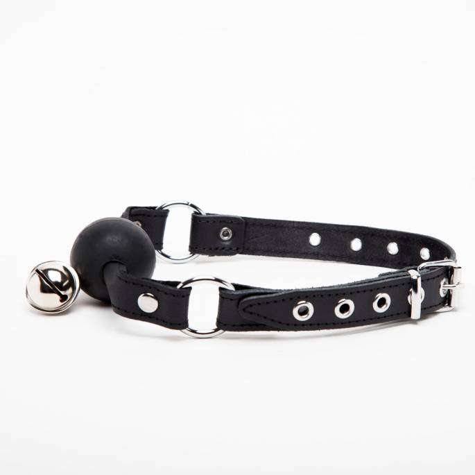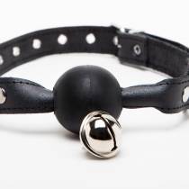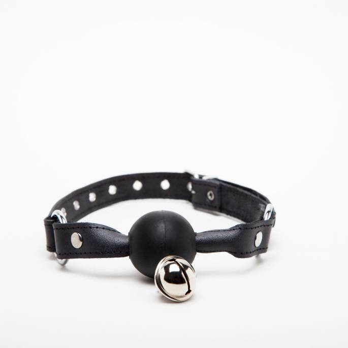 Ball gag with bell for role play and BDSM. Soft silicone ball, adjustable straps and playful tinkling for captivating sessions.