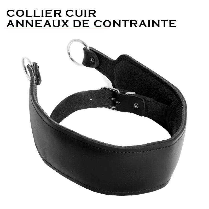Superb fine black leather necklace, adjustable (8 positions), inserted in a larger piece of smooth leather on top, and padded inside with a ring at each end to attach padlocks, carabiners or other constraint of your choice.
