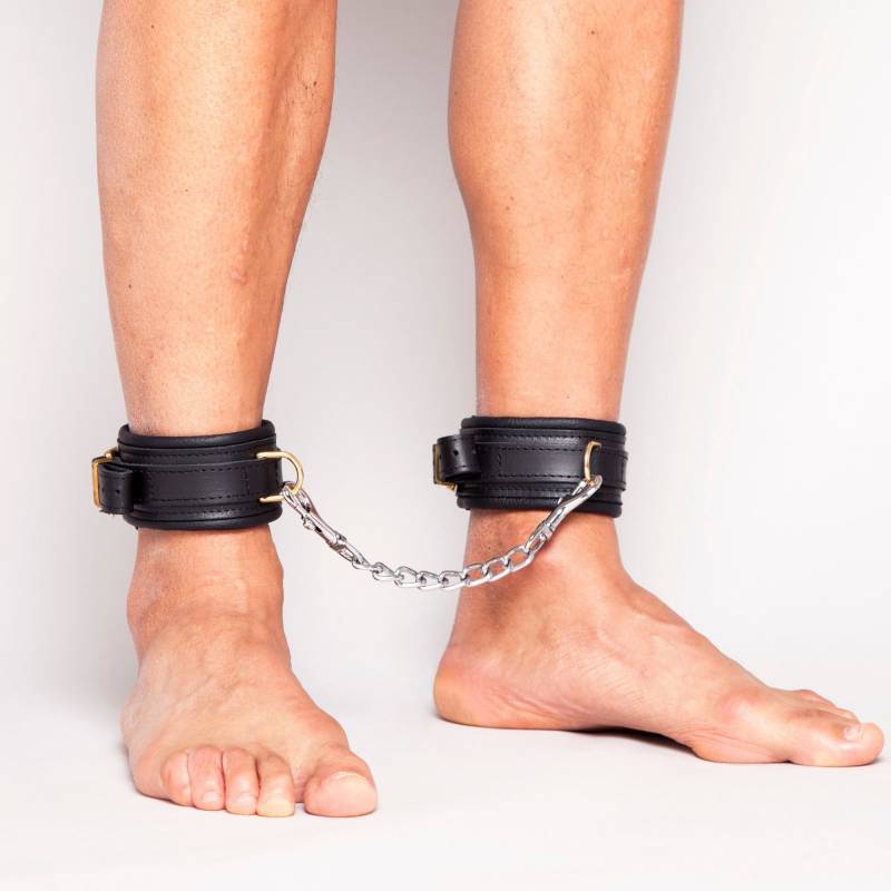 Black leather anklets from the Dèmonia collection with a golden ring on the strap.