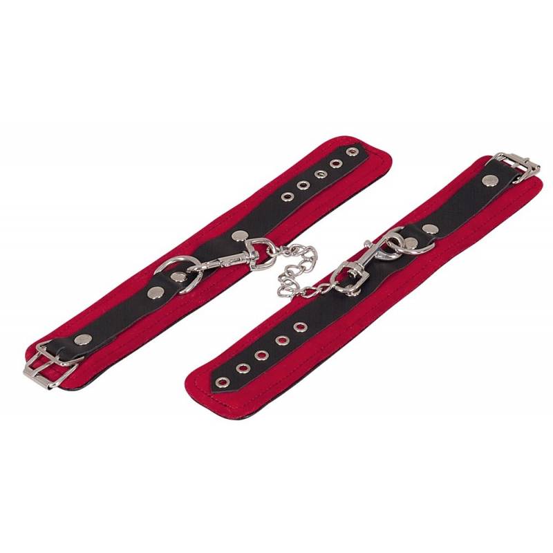 Beautiful ankle cuffs in red leather, lined with black leather, each with a black leather strap riveted with an adjustable buckle and a ring.