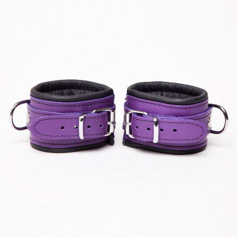 Black and purple leather handcuffs of very good quality with "on" riveted straps and metal ring, from the"DEMONIA collection".