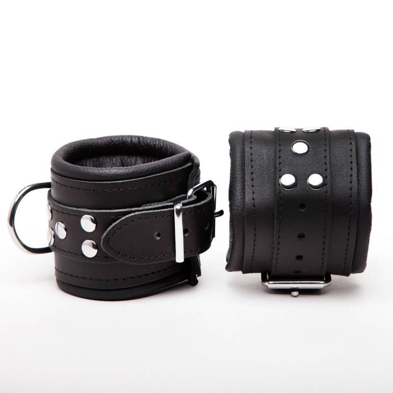 Black leather handcuffs, padded for comfort.
