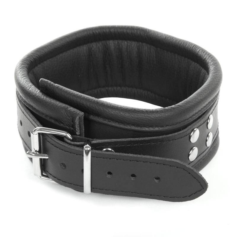 Black leather collar with padding on the edges for maximum comfort. A strap riveted to the collar and containing 10 holes with buckle allows a perfect maintenance whatever your neck size.